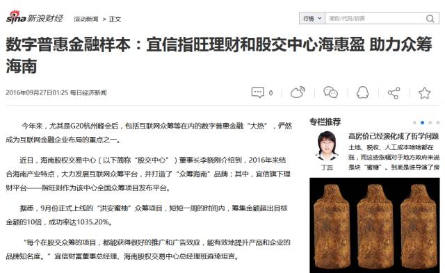 9月23日,海南股權(quán)交易中心在椰城??谂e辦“數(shù)字金融在海南暨互聯(lián)網(wǎng)+農(nóng)業(yè)研討會”,研討會上討論了多項重要議題,尤其是“眾籌海南”項目,受到了高度關(guān)注。國內(nèi)主流財經(jīng)媒體《每日經(jīng)濟新聞》以《數(shù)字普惠金融樣本:宜信指旺理財和股交中心?;萦Ρ娀I海南》對本次研討會做了重要報道,文章刊發(fā)后,被新浪、網(wǎng)易、金融界、鳳凰、全景網(wǎng)、同花順財經(jīng)等主流媒體網(wǎng)站轉(zhuǎn)載。