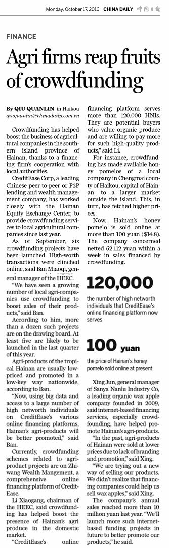 文章寫道,“CreditEase Corp, a leading Chinese peerto peer or P2P lending and wealth management company, has worked closely with the Hainan Equity Exchange Center, to provide crowdfunding services to local agricultural companies since last year. Agri-products of the tropical Hainan are usually lowpriced and promoted in a lowkey way nationwide, according to Ban. ‘Now, using big data and access to a large number of high networth individuals on CreditEase’s various online financing platforms,Hainan’s agriproducts will be better promoted, ’said Ban.”(譯注:互聯(lián)網(wǎng)金融領(lǐng)先企業(yè)宜信公司與海南股權(quán)交易中心密切合作,從去年開始為當(dāng)?shù)氐霓r(nóng)業(yè)公司提供眾籌服務(wù)。海南熱帶農(nóng)產(chǎn)品通常價(jià)格較低,在全國推廣的方式也很低調(diào),據(jù)班淼琦介紹,“現(xiàn)在,通過使用大數(shù)據(jù)和擁有大量高凈值人群的宜信在線融資平臺(tái),海南的農(nóng)產(chǎn)品將得到更好的推動(dòng)?!保?/span>