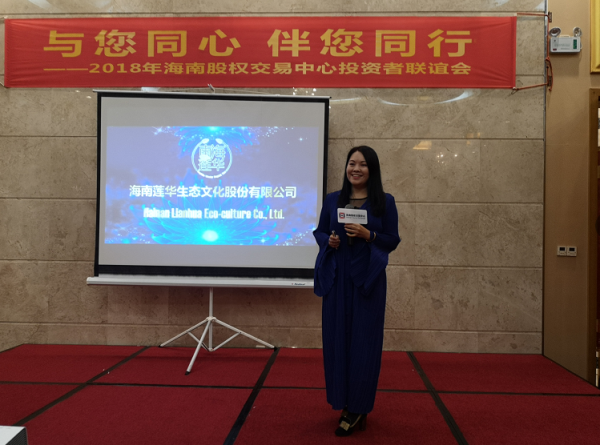聯(lián)誼會(huì)現(xiàn)場(chǎng),海南蓮華(海南股交掛牌企業(yè))總經(jīng)理賀霞進(jìn)行了企業(yè)介紹及產(chǎn)品展示,并分享了企業(yè)在海南股交掛牌后借助資本市場(chǎng)力量推動(dòng)企業(yè)持續(xù)健康發(fā)展的成功經(jīng)驗(yàn)。