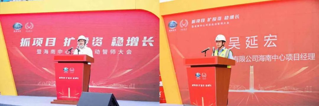 ▲海南中心項目負責人王敏(左)、中建三局項目負責人吳延宏(右)表態(tài)發(fā)言。