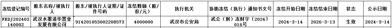 依據(jù)武漢市公安局《協(xié)助凍結(jié)財產(chǎn)通知書》[武公(刑)凍財字〔2024〕016號]文件,我中心為海南昌江長江村鎮(zhèn)銀行股份有限公司(企業(yè)代碼:893521)股東武漢水墨清華置業(yè)發(fā)展有限公司辦理股權(quán)凍結(jié)登記,具體情況如下: