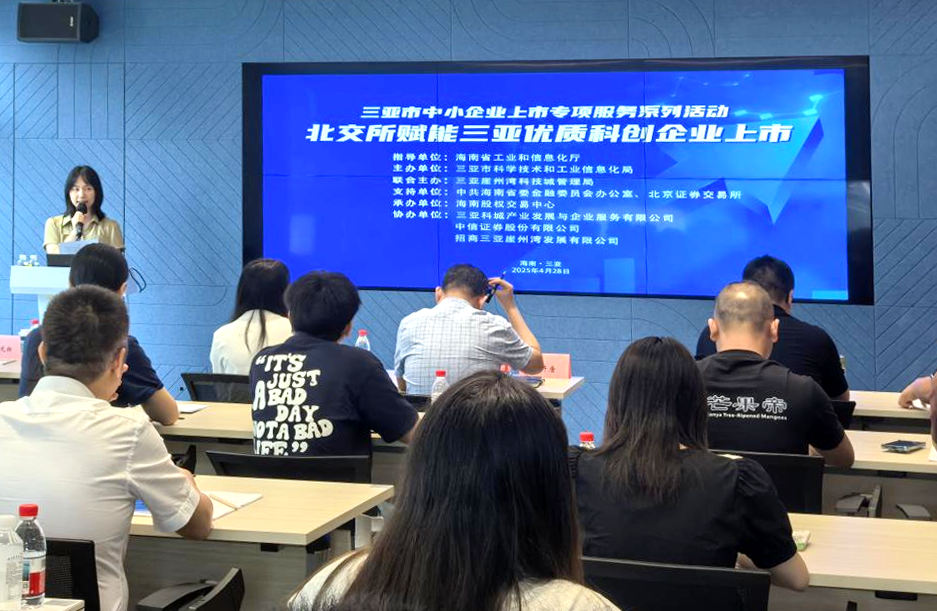 為深入貫徹黨的二十大精神及海南省委、省政府關(guān)于資本市場(chǎng)發(fā)展的部署,充分發(fā)揮資本市場(chǎng)對(duì)海南自由貿(mào)易港高質(zhì)量發(fā)展的推動(dòng)作用,4月28日,由三亞市科學(xué)技術(shù)和工業(yè)信息化局與三亞崖州灣科技城管理局聯(lián)合主辦的“北交所賦能三亞優(yōu)質(zhì)科創(chuàng)企業(yè)上市培訓(xùn)活動(dòng)”在三亞舉辦。此次活動(dòng)旨在幫助創(chuàng)新型中小企業(yè)明確上市路徑,更好地融入資本市場(chǎng),加速實(shí)現(xiàn)高質(zhì)量發(fā)展。三亞市相關(guān)部門、金融服務(wù)機(jī)構(gòu)、優(yōu)質(zhì)中小企業(yè)等相關(guān)負(fù)責(zé)人參加了此次活動(dòng)。