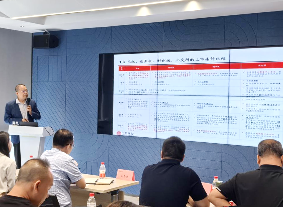 會(huì)上,北京證券交易所專家圍繞北交所的基本情況、運(yùn)行情況、市場(chǎng)制度特色及未來服務(wù)方向進(jìn)行了培訓(xùn)輔導(dǎo)。中信證券專家從企業(yè)上市的目的、意義及如何選擇上市路徑展開講解,并就企業(yè)如何結(jié)合監(jiān)管要求,從實(shí)務(wù)層面分析企業(yè)上市需要準(zhǔn)備的財(cái)務(wù)、法律、業(yè)務(wù)等各項(xiàng)工作進(jìn)行了詳細(xì)解讀,同時(shí)還圍繞A股上市流程、北交所上市實(shí)務(wù)操作等企業(yè)關(guān)注的內(nèi)容進(jìn)行了經(jīng)驗(yàn)分享。